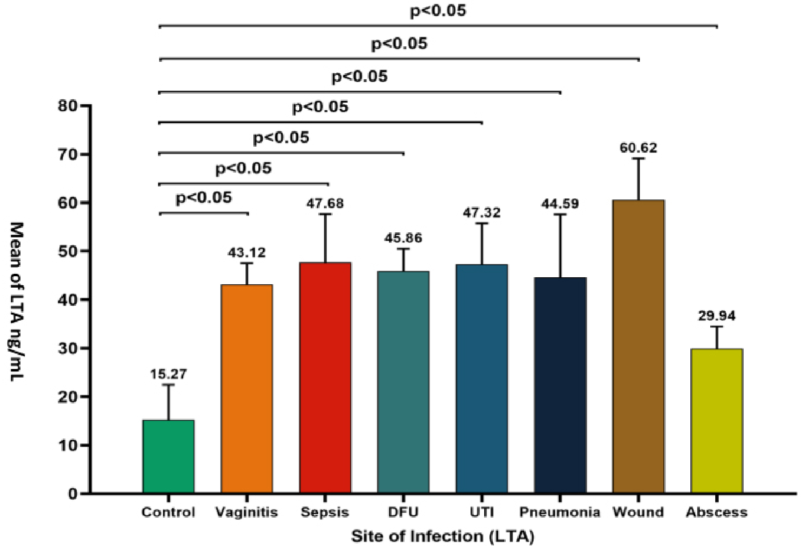 - Gram-positive bacteria commonly cause bloodstream and other infections in hospitalized patients, with an increasing proportion of infections associated with antibiotic-resistant bacteria. Existing diagnostic methods have several limitations, such as delayed turnaround time and difficulty in distinguishing between bacterial colonization and active infection. Timely detection and appropriate antibiotic treatment are crucial for reducing morbidity and mortality. This study investigated the diagnostic potential of combining lipoteichoic acid (LTA), a molecule specific to Gram-positive bacteria, with soluble urokinase plasminogen activator receptor (suPAR), a biomarker with prognostic significance. The study aimed to develop a faster and more accurate method for diagnosing infections and differentiating colonization from active infection. A case–control study was conducted using serum samples from 62 patients with clinically diagnosed bacterial infections and from 38 healthy controls. Bacterial pathogens and antimicrobial susceptibility profiles were identified using standard laboratory procedures and the VITEK2 automated system. The participants’ serum suPAR and LTA levels were measured via ELISA. Analysis of variance was employed for group comparisons (p < 0.05), whereas receiver operating characteristic curve analysis was used to evaluate the sensitivity, specificity, and accuracy of the diagnostic metrics. Significant differences were observed in the LTA and suPAR levels (p = 0.0002 and p = 0.0007, respectively) between the infected patients and healthy controls. The area under the curve values were 99.57% and 99.41% for suPAR and LTA, respectively, indicating strong diagnostic accuracy. The sensitivity was 98.39% for suPAR and 95.16% for LTA, with corresponding specificity of 93.33% and 96.67%. These findings suggest that suPAR and LTA are promising biomarkers for the rapid diagnosis of Gram-positive bacterial infections, facilitating timely and appropriate treatment. - COLLAPSE