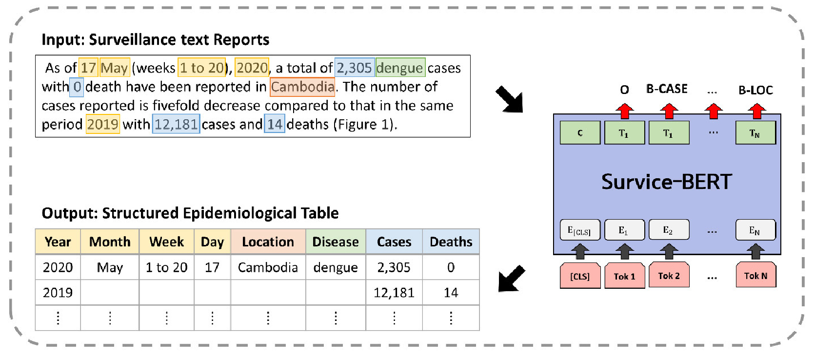 - Since the onset of the COVID-19 pandemic, research on infectious disease surveillance has advanced rapidly, driven by the convergence of computing technologies with biology, medicine, and public health. A persistent challenge in the early stages of outbreaks is the lack of structured data, which hinders timely analysis and response. To address this issue, we present a domain-specific named entity recognition (NER) dataset derived from infectious disease surveillance reports and introduce Survice-BERT, a bidirectional encoder representations from transformers (BERT)-based model fine-tuned on this dataset for pandemic-related information extraction. Survice-BERT achieves an average F1-score of 0.99, demonstrating its ability to extract information with high accuracy and support forecasting for early warning of communicable diseases. We anticipate that the model will be valuable to practitioners across multiple fields. Survice-BERT is publicly available at https://github.com/csanny/Survice-BERT. - COLLAPSE