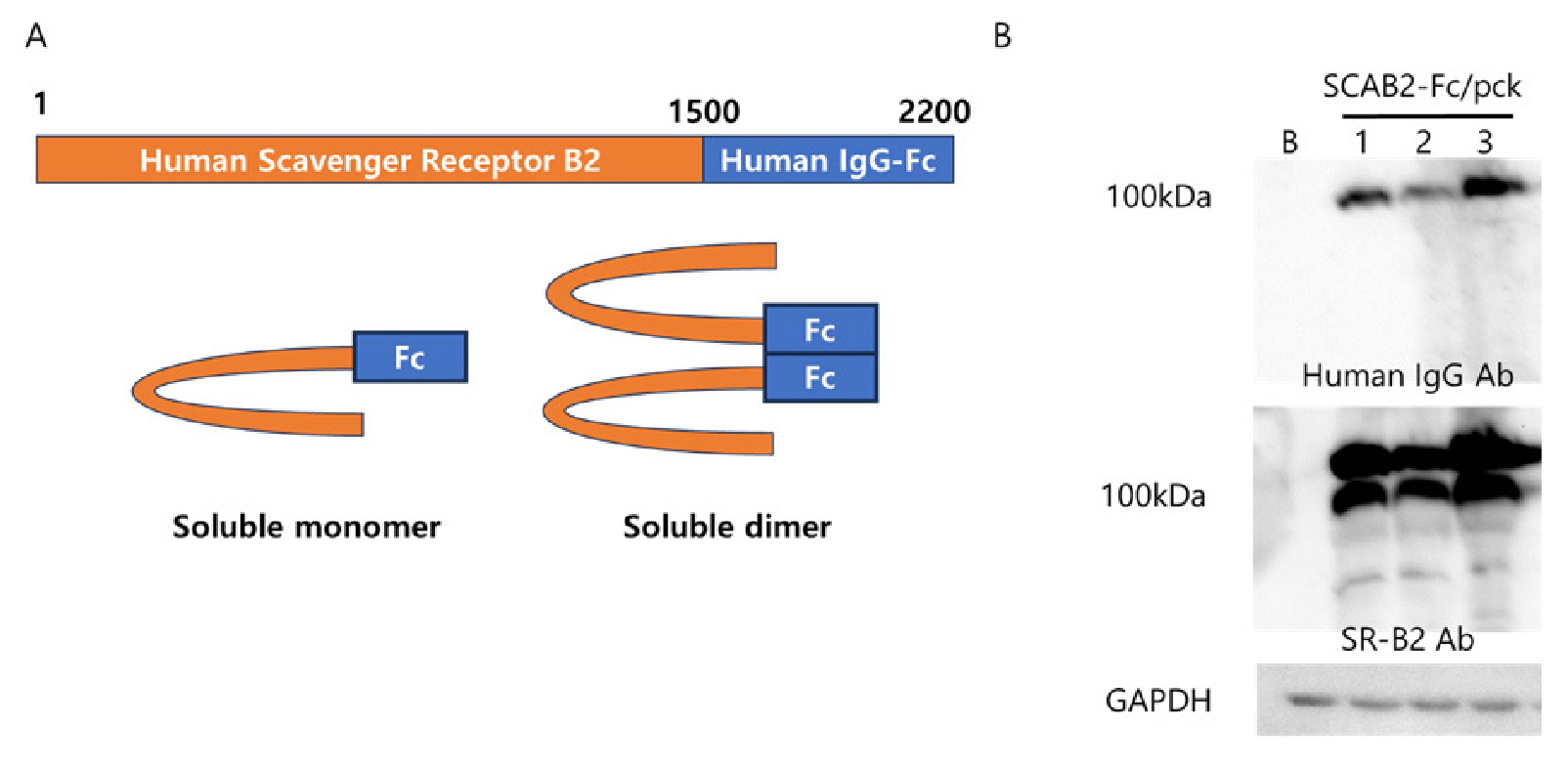 - Hand, foot, and mouth disease (HFMD) can show severe clinical symptoms in children and infants, such as fever, mouth ulcers, and vesicular rashes on the palms and feet. Enterovirus 71 (EV71) is the leading cause of this disease. In this study, we investigated the antiviral effect of soluble scavenger receptor type B2 (SCAB2, CD36) to develop a new therapeutic approach for HFMD. Soluble SCAB2:Fc was generated by using the human IgG1 Fc region. The SCAB2 gene was cloned into the expression plasmid with human IgG1 Fc sequences (SCAB2:Fc/PCK). SCAB2:Fc/PCK plasmid was transfected into HEK293T cells for 72 hours. Then the cell protein was extracted, and the culture supernatant was collected. The supernatant SCAB2:Fc protein was concentrated, and its concentration was measured using a human IgG1 ELISA kit. SCAB2:Fc strongly blocked the EV71 target cell entry in a dose-dependent manner. The antiviral activity of SCAB2:Fc was observed by western blot analysis and reverse transcription PCR (RT-PCR). VP1 capsid protein and virus-positive-strand RNA were significantly decreased in 100 ng/ml of SCAB2:Fc treatment. Transcription factor, eIF4G1, and cleaved caspases3 levels were reduced considerably with SCAB2:Fc treatment. Moreover, inhibiting virus infection strongly suppressed virus replication and cell proliferation regulating MAPK signaling. The phosphorylation of p38 and ERK1/2 was significantly decreased by SCAB2:Fc treatment. These data suggested that SCAB2:Fc inhibited EV71 infection and virus replication-induced MAPK signaling activity. In this study, the antiviral effect of soluble SCAB2 was investigated to develop an EV71 treatment. Soluble SCAB2:Fc showed potent antiviral activity in vitro, and it could be a potential candidate material to use as a therapeutic drug for EV71-induced HFMD. - COLLAPSE