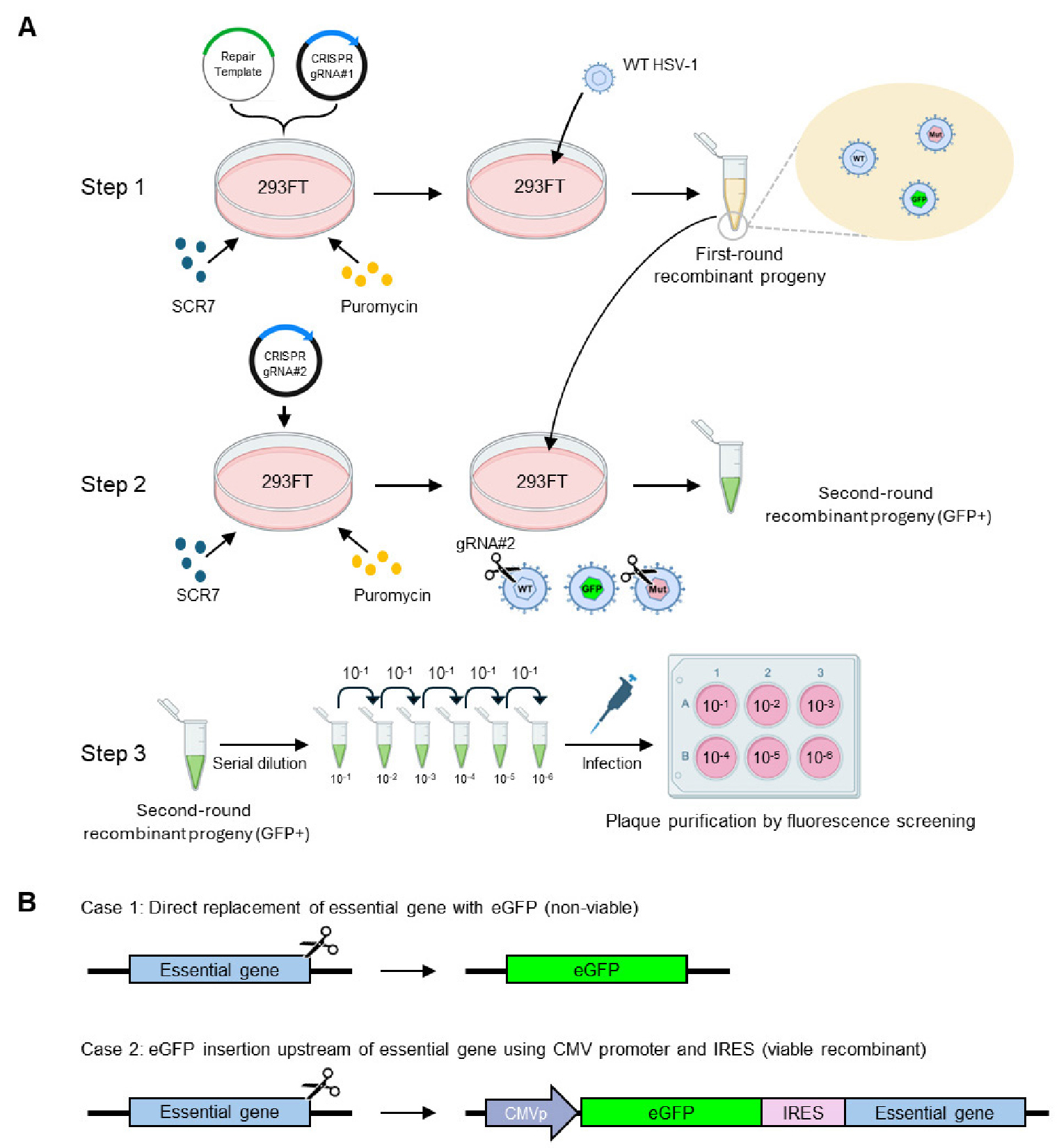 - Herpes simplex virus type 1 (HSV-1) is a large, double-stranded DNA virus whose genome encodes numerous essential genes required for viral replication and pathogenesis. Genetic manipulation of these essential genes remains challenging because conventional CRISPR/Cas9-based editing strategies often involve initial deletion of the target gene, resulting in loss of viral viability. To overcome this limitation, we developed a CRISPR/Cas9-based GFP cassette insertion-replacement strategy incorporating an internal ribosome entry site (IRES), enabling bicistronic expression of a fluorescent selection marker and an essential viral gene without disrupting gene function. As proof of concept, we targeted the essential tegument gene UL36 and inserted a CMV promoter-eGFP-IRES cassette upstream of its ORF, allowing simultaneous expression of eGFP and UL36. The cassette was subsequently replaced with a UL36 mutant harboring a deubiquitinase (DUB)-inactive C40S substitution. This approach preserved viral viability and achieved high homology-directed repair (HDR) efficiency, allowing precise introduction of point mutations into essential genes. Our IRES-guided genome editing strategy provides a robust and versatile platform for precise manipulation of essential genes in HSV-1 and other large DNA viruses. - COLLAPSE