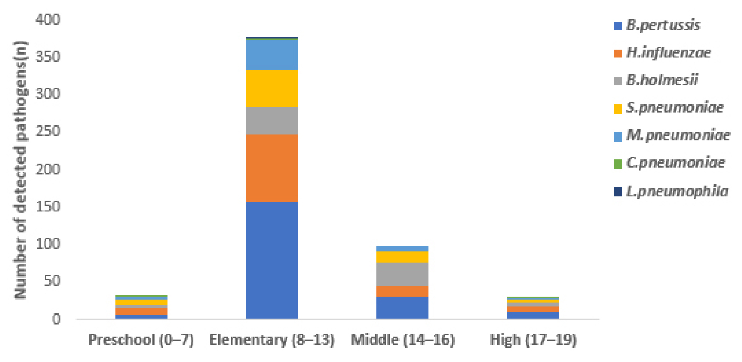 - Following the COVID-19 pandemic, the epidemiology of respiratory infectious diseases has changed substantially, with a marked resurgence of pertussis among children and adolescents in Korea in 2024. Although current molecular diagnostic methods for pertussis, based on detection of IS481, provides high sensitivity, they have limitations in differentiating closely related Bordetella species and in identifying concomitant bacterial respiratory pathogens. Moreover, region-specific surveillance data for bacterial respiratory infections remain limited compared with those for viral respiratory infections. From July–December 2024, in total, 607 respiratory specimens were collected from pertussis-positive patients under aged < 19 years at private medical institutions in Busan. These comprised 602 nasopharyngeal swabs and five sputum samples. Using nucleic acid amplification methods, six major bacterial respiratory pathogens, along with the pertussis-related species B. holmesii, were investigated. Age group–specific distributions, pathogen detection patterns, and co-detection profiles were evaluated. Among the 607 specimens, at least one bacterial respiratory pathogen was detected in 366 cases (60.3%). B. pertussis was the most frequently detected pathogen (205 cases), followed by Haemophilus influenzae (119 cases), B. holmesii (79 cases), Streptococcus pneumoniae (73 cases), and Mycoplasma pneumoniae (55 cases). Pathogen detection was most prominent in school-aged children and adolescents. Co-detection of two or more bacterial pathogens was identified in 142 cases (38.8%), including dual detections in 115 cases, triple co-detections in 25 cases, and quadruple co-detections in two cases. Notably, co-detections involving B. pertussis and M. pneumoniae was relatively common. This study provides a comprehensive characterization of the distribution and co-detection patterns of bacterial respiratory pathogens in pertussis-positive specimens from children and adolescents during the 2024 pertussis resurgence in Busan. These findings underscore the importance of considering concomitant bacterial infections in patients with pertussis-like symptoms and may serve as baseline data for strengthening region-specific surveillance and the development of multi-pathogen–oriented diagnostic and treatment strategies for bacterial respiratory infections. - COLLAPSE