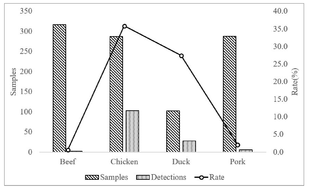 - This study investigated the serotype distribution and antimicrobial resistance profiles of Salmonella spp. isolated from retail meat products distributed in Gwangju Metropolitan City, Republic of Korea, between 2022 and 2024. A total of 139 Salmonella isolates were recovered from 994 meat samples collected from retail markets. All Salmonella isolates were serotyped and tested for antimicrobial susceptibility against 16 antimicrobial agents. Salmonella spp. Were predominantly isolated from poultry products, accounting for 94.2% of the total isolates. The highest isolation rates were observed in chicken (35.9%) and duck (27.5%), whereas pork (2.1%) and beef (0.6%) showed relatively low prevalence. Among poultry products, processed cut meats exhibited a higher isolation rate (40.6%) than raw meats (25.4%). Fifteen distinct serotypes were identified. S. Infantis was the most predominant serotype (70.5%), followed by S. Typhimurium (11.5%); together, these two serotypes accounted for more than 80% of all isolates. Antimicrobial susceptibility testing revealed high resistance rates to nitrofurantoin (79.9%), ampicillin (74.1%), cefazolin (73.4%), and cefotaxime (73.4%). Multidrug resistance defined as resistance to two or more antimicrobial agents, was observed in 76.3% of isolates, while only 13.7% were susceptible to all tested agents. Notably, 98.0% of S. Infantis isolates exhibited multidrug resistance, and the majority were recovered from poultry products. These findings suggest that frequent bacterial transmission in poultry raised under intensive farming conditions, likely facilitated by close contact and highlight the need for strengthened surveillance and management practices to reduce Salmonella contamination in poultry products. The results of this study provide fundamental data for epidemiological investigations and clinical management of Salmonella-associated foodborne illnesses in the Gwangju region. - COLLAPSE